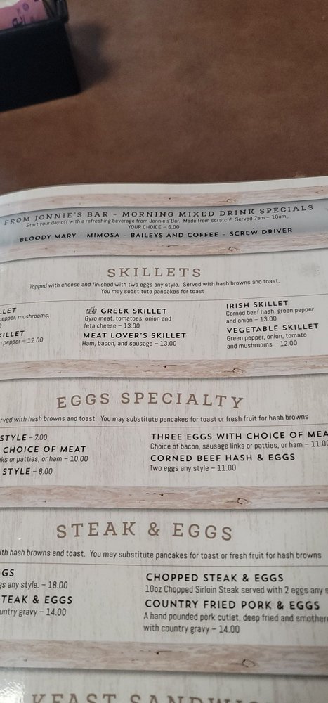 Appetizers Garden Salads Steaks & Chops Italian Favorites Seafood House Specialties Charbroiled Burgers Chicken Sandwiches Signature Sandwiches Wra Melts Clubs Hot Manhattans Eggcellent Omelettes Biscuits & Gravy Steak & Eggs French Toast & Pancakes Break Last Specials Saturday Specials Comelettes Belgian Waffles Others